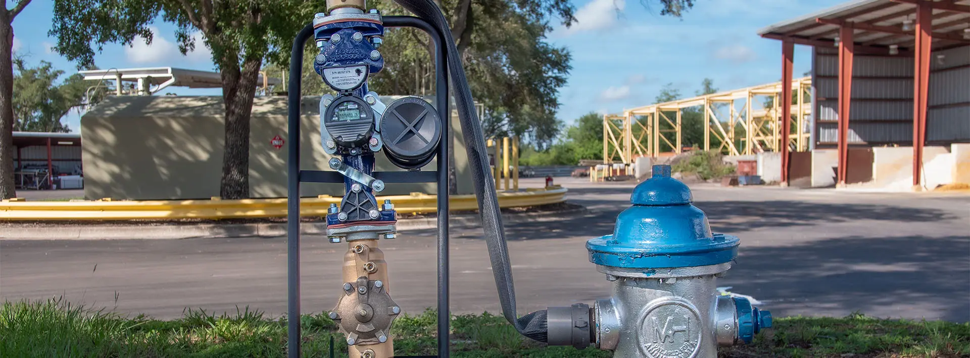 Portable meters on hydrants are equipped with reduced pressure backflow prevention devices that are to remain installed at all times. These are required to protect the water system from contamination. If the portable meter will be mounted on a truck, the backflow prevention assembly will not be provided, since the trucks are required to have an approved air gap installed and inspected by OUC within 15 days of pick up.