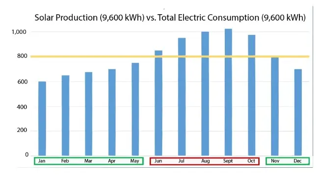 Net-zero is when your annual solar production equals your annual consumption. In order for this to happen, the right number of panels have to be installed. Even then, there are months (like the summer) when the production won’t cover your consumption. For example, if your annual solar production is 9,600 kWh and annual consumption is 9,600 kWh, you would be considered net-zero for the year. However, during the summer months (June through October), your consumption may be higher than your solar production.